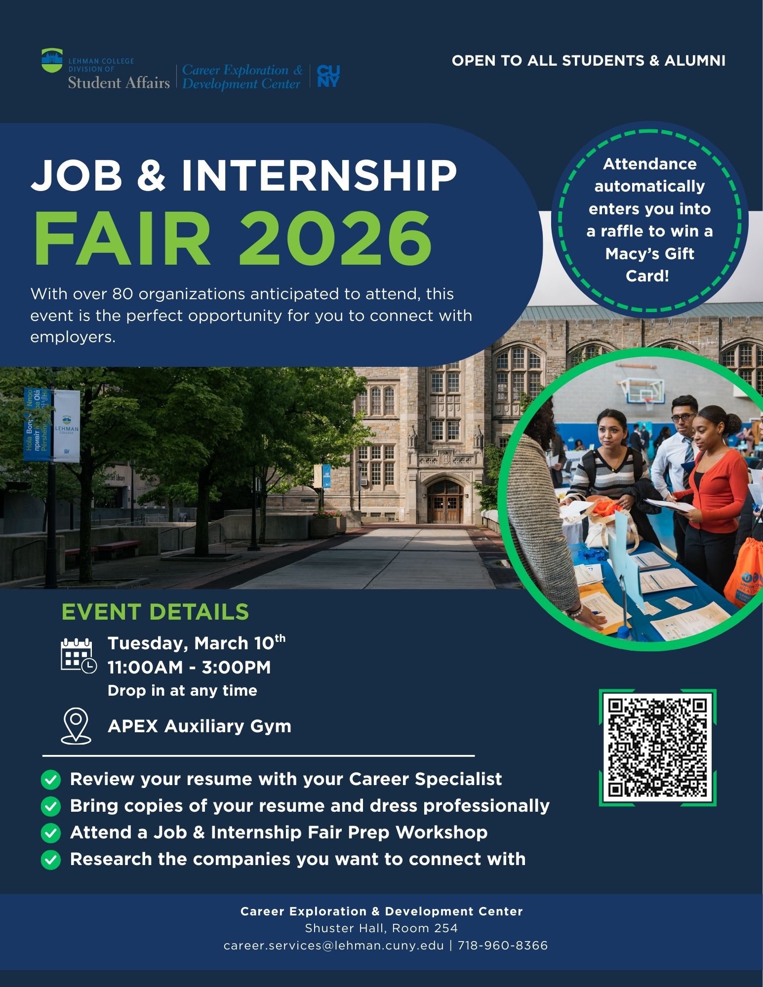 718-960-8366 career.services@lehman.cuny.eduLehman College’s Job & Internship Fair provides students and alumni with the opportunity to connect directly with employers recruiting for full-time, part-time, and internship opportunities.