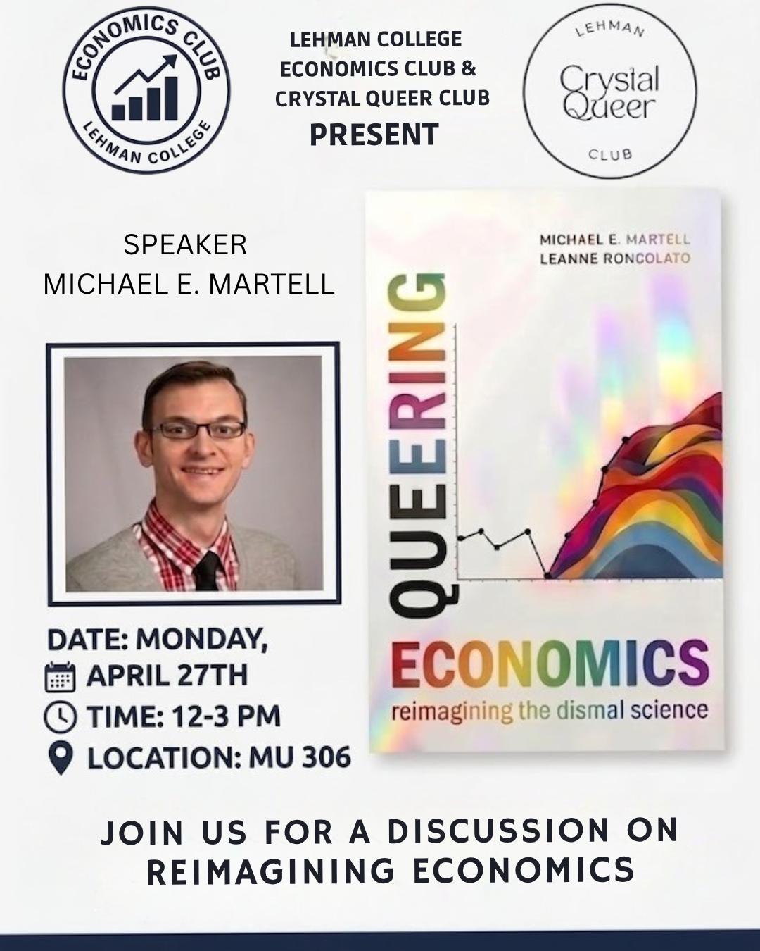 Author Michael E. Martell will lead a discussion on his book Queering Economics: Reimagining the Dismal Science. This event is presented by the Lehman College Economics Club and the Crystal Queer Club.