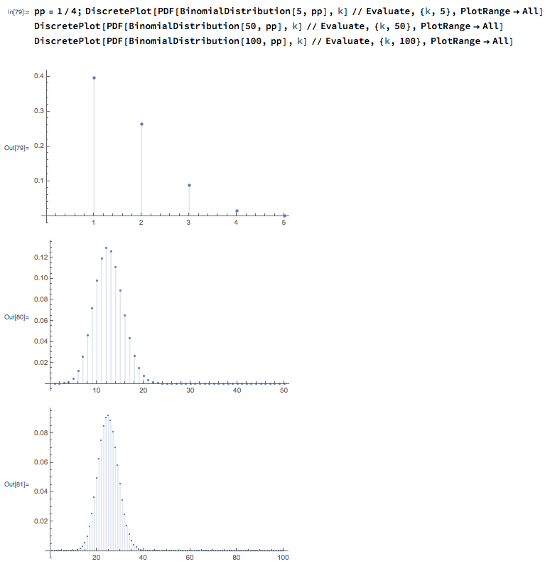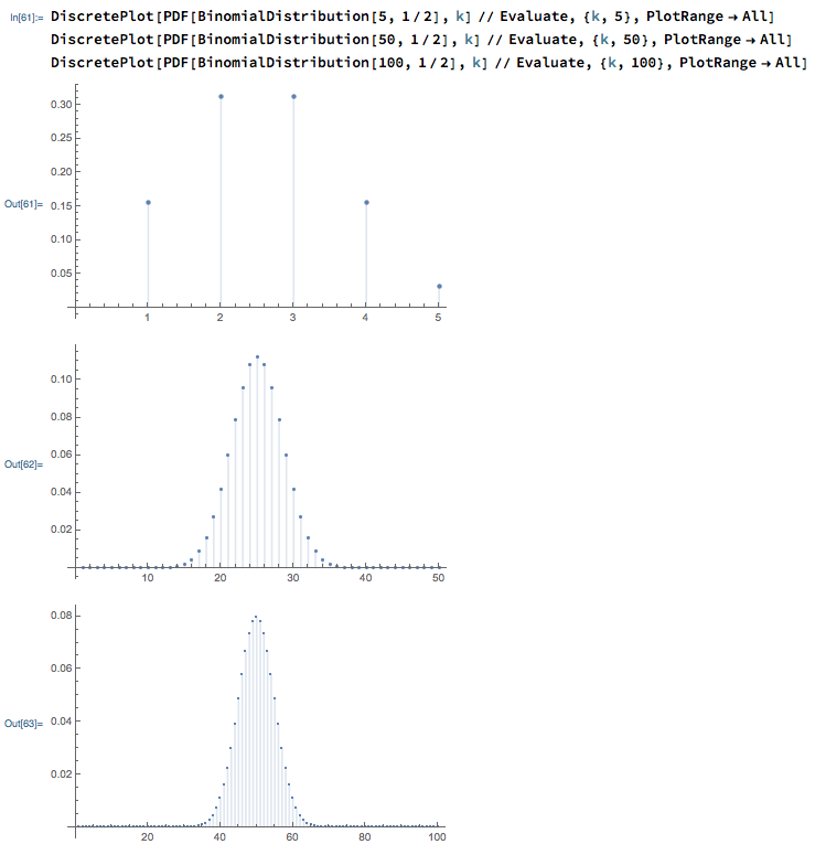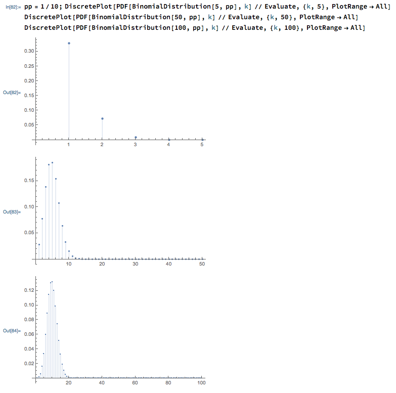 • Histograms with $n=5,50,100$ and $p=\frac12,\frac14,\frac{1}{10}$. Click on the image to make it larger, and use External Link 1 below for an interactive way of visualizing this.