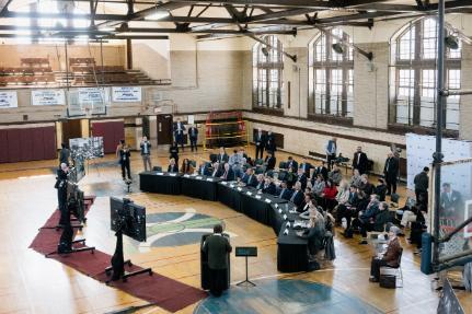As the Council members made their way up to the Old Gym, they were presented with facsimiles of the tickets used by members of the public who viewed the original 1946 meetings. Photographs of the meeting were placed along the route to create a visual timeline connecting their tour to the Security Council’s history on campus, and the space was arranged to resemble the original 1946 setup—minus the expedited construction that made the first meeting possible in just two weeks.