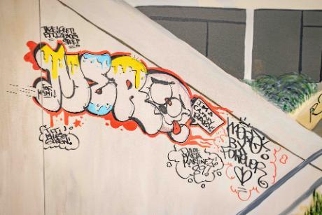 The event also highlighted Mero’s roots in Bronx hip-hop culture. Alumna Rumarie Denizard, and art students Tasheba Gallimore and Estephanie Quiroz, under the guidance of Associate Professor and Chair Gina Dominique Hersey, collaborated this past year on a large-scale mural for the event called “Academic Tags,” which brought together different perspectives of the Lehman campus. As Mero added his tag and they added theirs, the mural became a collaborative work that connected student artists with one of the Bronx’s best-known cultural voices.